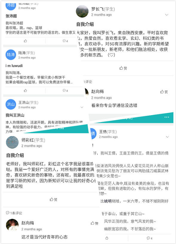 “用餐者”口味如何呢?开播前,通过摸底测试掌握学生学习基础,通过讨论版的自我介绍,初步了解学生特点,也借此给居家隔离的同学一次施展的机会。