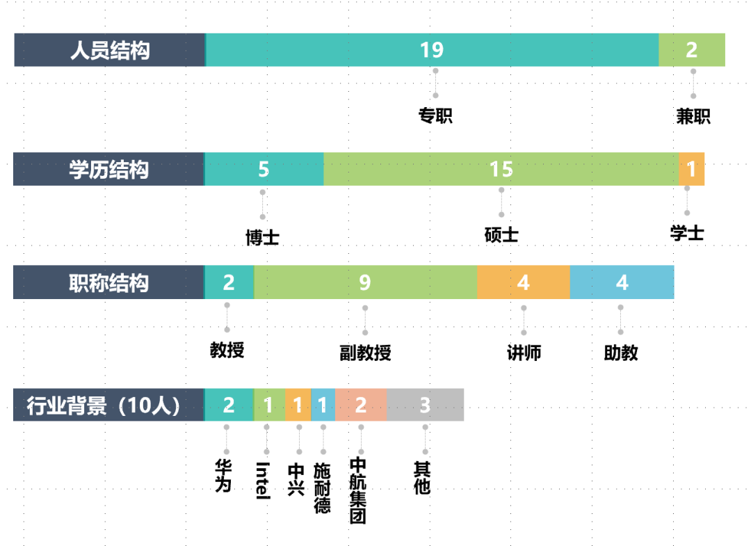 团队成员来自芬兰阿尔托大学、西安交通大学、西安电子科技大学等国内外知名高校,以及Intel、华为、施耐德等知名企业,其中高级职称教师占比62%,硕士以上学历教师占比95%,行业背景教师占比38%,教学科研能力强。