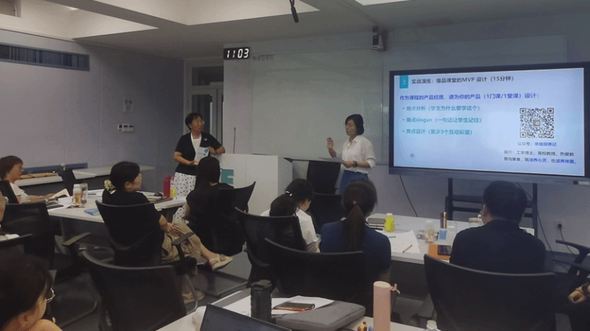 马老师引导参与的老师“作为课程的产品经理,设计你的产品(1 门课 /1 堂课)”,老师们分小组,热烈讨论,用彩笔设计着自己的爆款课程。其中,耿菲、李娜和陈丽萍老师积极分享了自己的“课堂产品”,引发了老师们积极的讨论和发言。