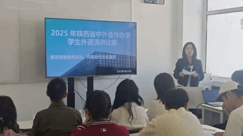 The qualification trial for the “2025 Shaanxi Province Foreign Language Speech Contest for Students in Sino-Foreign Cooperative Education Programme” was successfully held in B602 at 13:30 on September 24. The contest was themed “Demonstrating Youth's Mission and Responsibility, Building a Strong Cultural Voice for the Times.” It aimed to enhance students’ language expression skills and cultural communication awareness, showcasing the comprehensive qualities and spirit of our students .