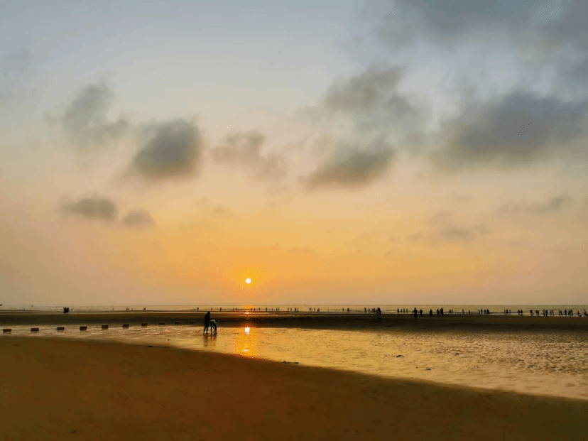 “晨光破云,第一缕金箔落在海平线,潮水褪去的沙滩上,赶海的人弯腰拾贝,新一天的故事正从浪花褶皱里生长。”