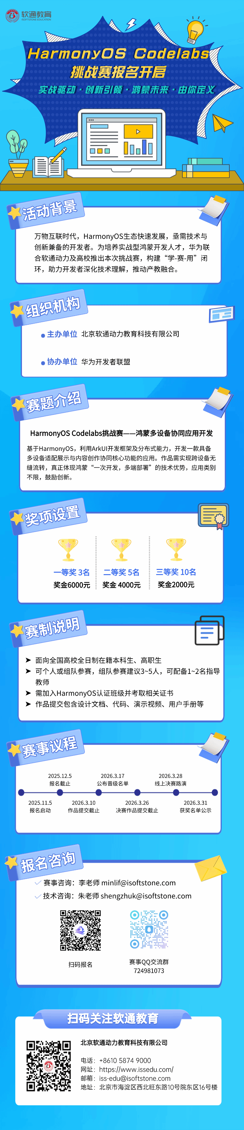 为搭建技术实践与创新展示的优质平台,培养实战型鸿蒙开发人才,华为联合软通动力及高校推出本次挑战赛,构建“学-赛-用”闭环,助力开发者深化技术理解。本次赛事聚焦开源鸿蒙生态核心技术,诚邀技术爱好者携手出征,用代码竞技,赢取丰厚奖励。