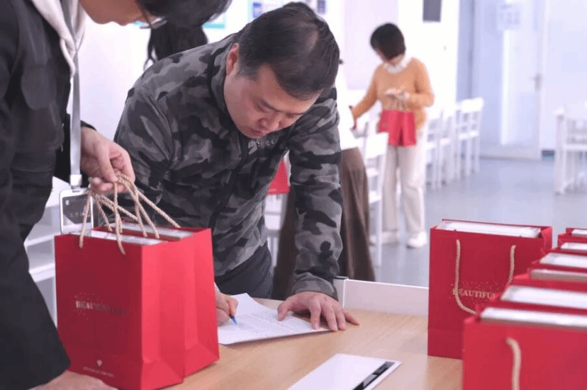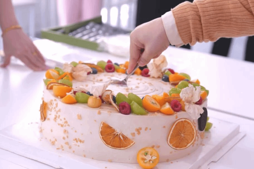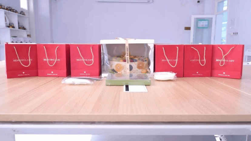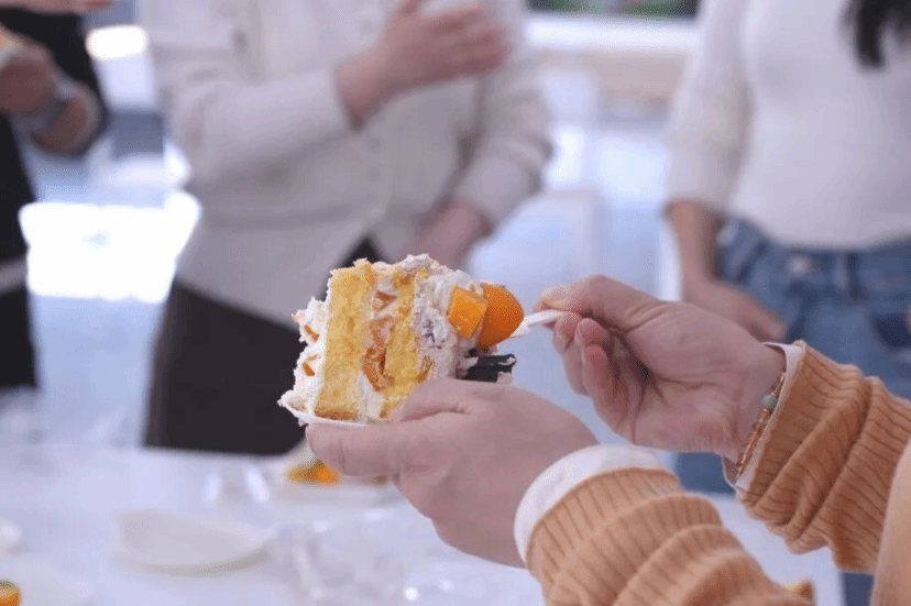 教室内装饰简洁而温馨,阳光透过卷帘洒下斑驳的树影,营造出宁静而治愈的氛围。桌上的水果蛋糕点缀着新鲜果粒,内部隐藏着芒果酱的惊喜;旁边整齐摆放的花酿芬芳护手霜礼盒,满含着学院对老师们的细致关怀。老师们笑意盈盈入场围坐,静候活动开始。